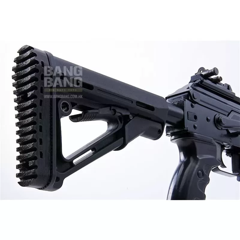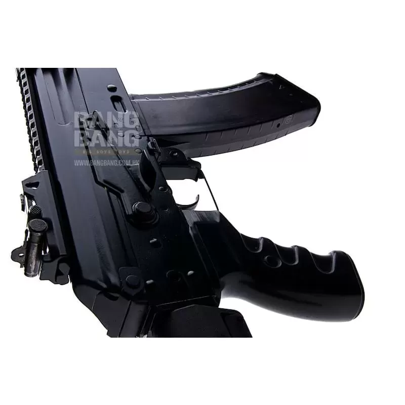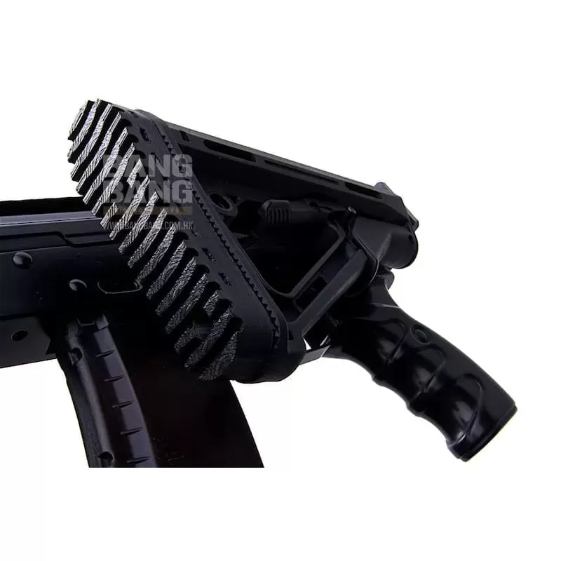 The version we have here is replicated from the gun that will be the next standard issue weapon for the Russian military going forward. There are actually several differences to this gun compared to the last one. Starting from the front, the hand guard is slimmer even though it does have rails on the bottom and top like the previous. The second notable difference is the color of all the plastic parts on this gun. On the previous AK12 it was more of a grey tone color where this one is all black. The magazine release goes back to the standard release with the lever we see on all AKs. They also improved upon their fire selector slightly with the addition of an easy to reach tab for you to select between your different modes of fire! Final difference is the stock. This one is very similar to the Magpul style MOE stock with a different butt pad. A standout feature, about this gun is going to be that this Ak12 is full steel so it's going to be heavy. Finally looking at this gun you will once again appreciate how NPO makes their guns extremely raw. You see all the brush marks in the steel, welding marks on the magazines, and where they did the filing, trying to replicate the rawness seen on the AK platform of guns.